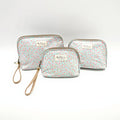 Conjunto de tres neceseres de la colección Petite Rose Garden, diseñados con proporciones versátiles para organizar tus espacios. El modelo grande (25x17cm) ofrece capacidad para artículos de uso frecuente, mientras que el mediano (22x15cm) y pequeño (18x13cm) se adaptan perfectamente a viajes, bolsos o almacenamiento selectivo. Su estructura gradual permite apilarlos eficientemente, optimizando tanto funcionalidad como estética en cualquier ambiente.